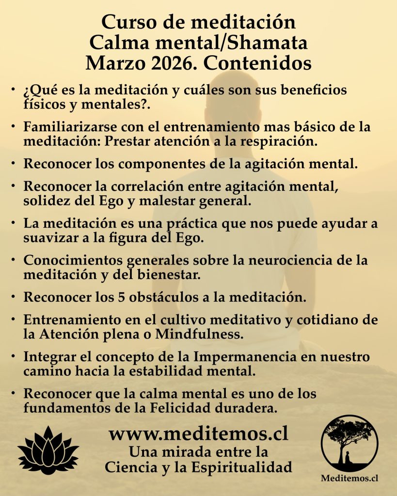 Hemos abierto oficialmente las inscripciones de nuestro curso de meditación para principiantes de MARZO 2026. Si quieres más información de este curso, pincha el siguiente enlace: http://www.meditemos.cl/shamata/